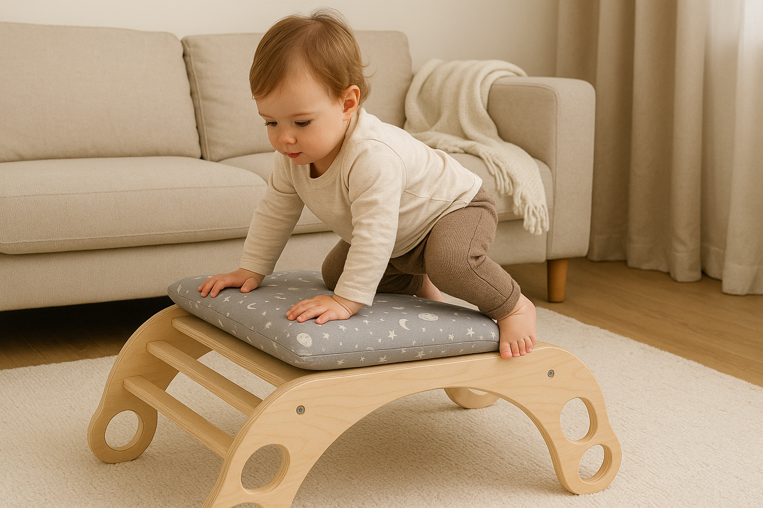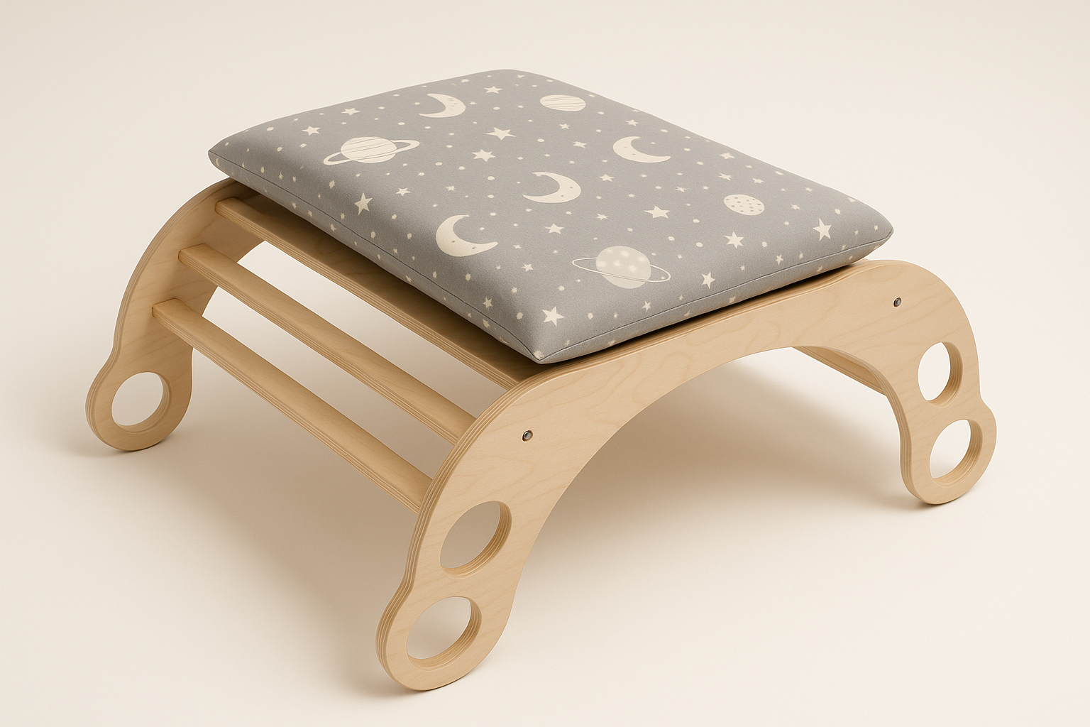 The ARCH/ROCKER SET 14 is designed to support a range of developmental needs in young children. This multifunctional set features a climbing arch/rocker and gray space design pillow made with Waldorf wooden material. Perfect for supporting kids' Montessori learning, this quality set encourages movement, exploration, balance and coordination.